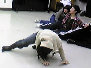 さて、そんな稽古場の休憩時間役者さんにカメラを向けるとなにやら変な顔を…